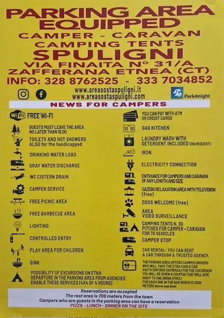 Conoscendo molto bene quelle che sono le esigenze della clientela, l’Area Sosta Attrezzata per camper Spuligni, situata a Zafferana Etnea, in provincia di Catania, è lieta di offrire delle piazzole per il soggiorno con tenda, camper o roulotte, estremamente comode e circondate da siepi a parete