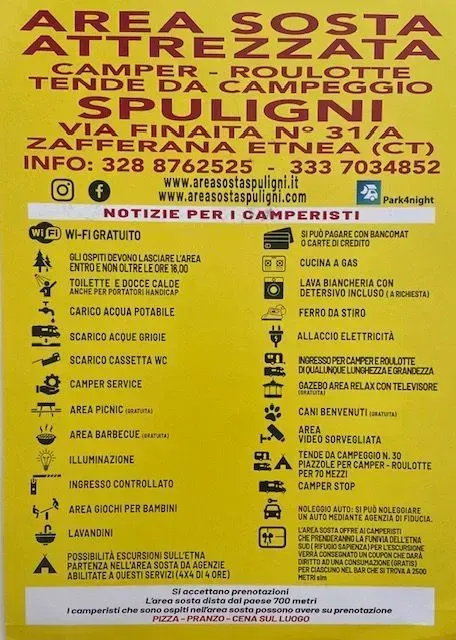 L’Area Sosta Attrezzata per Camper Spuligni a Zafferana Etnea, in provincia di Catania, situata in Via Finaita 31/A e Via Strada 14° n. 19 (solo pedonale). E' una struttura attrezzata che permette ai tantissimi turisti di soggiornare con il proprio camper - roulotte e tende in quel lembo di terra che separa il parco dell’Etna dal mare.